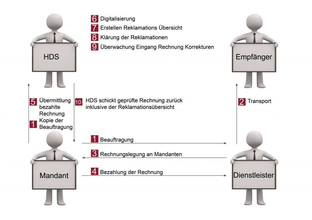 - HDS gibt die geprüften Rechnungen an seine Mandantin weiter inklusive der Reklamationsübersicht (optional auch mit Auswertungen & Reports)